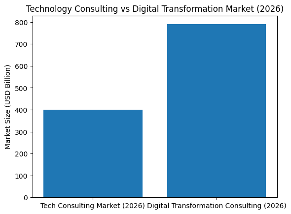 The technology consulting market has reached an inflection point. The global tech consulting market is projected to surpass $400 billion in 2026, growing at 7% annually. Digital transformation consulting specifically represents a $789.9 billion market in 2026, growing at 14.1% CAGR—indicating unprecedented demand from enterprises recognizing transformation as business-critical.
